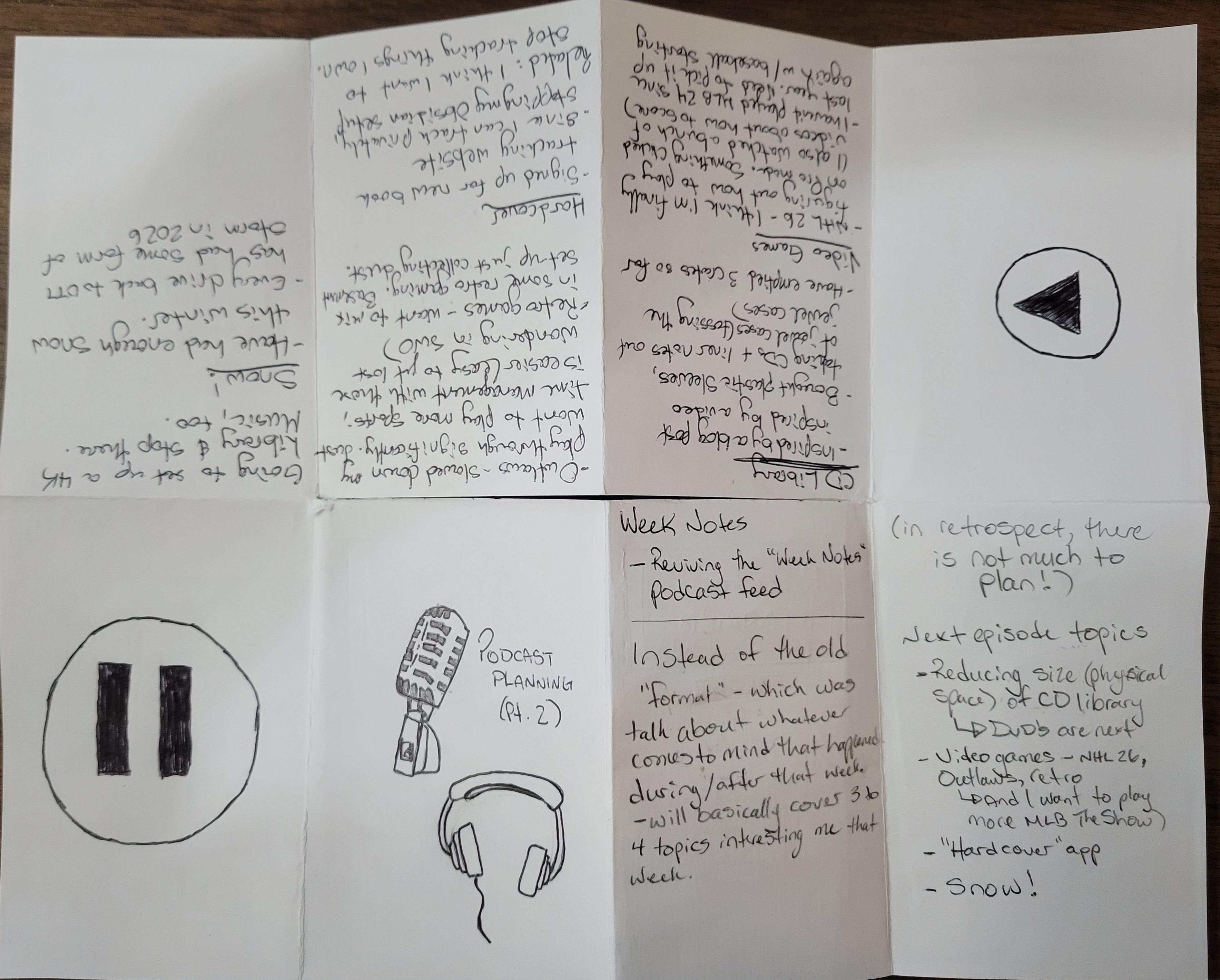 A while ago I was inspired to go back to creating one-page mini zines (or one-page notebooks, depending on your preference). I'm trying to get back into regular podcast recording so I made one for planning out my next recording session.